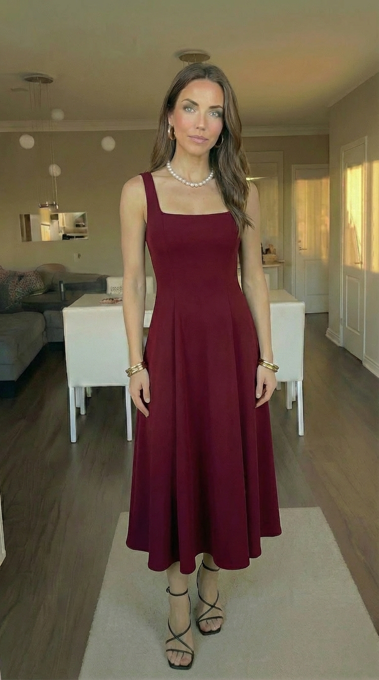 For evening events I added a statement necklace and strappy heels to elevate the look. The square neckline gives me space to wear bold jewelry or keep it minimal with drop earrings for a more refined feel.