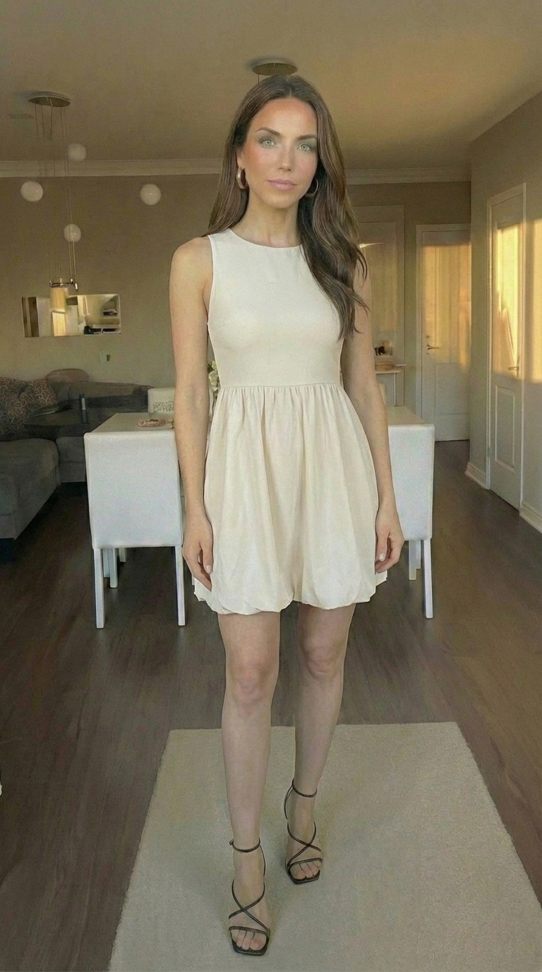 I like to pair this dress with layers depending on weather: a denim jacket or light cardigan for cool mornings, and a swimsuit as a cover-up for beach days. For chillier evenings, a lightweight trench or longline cardigan works well without overwhelming the bubble hem.