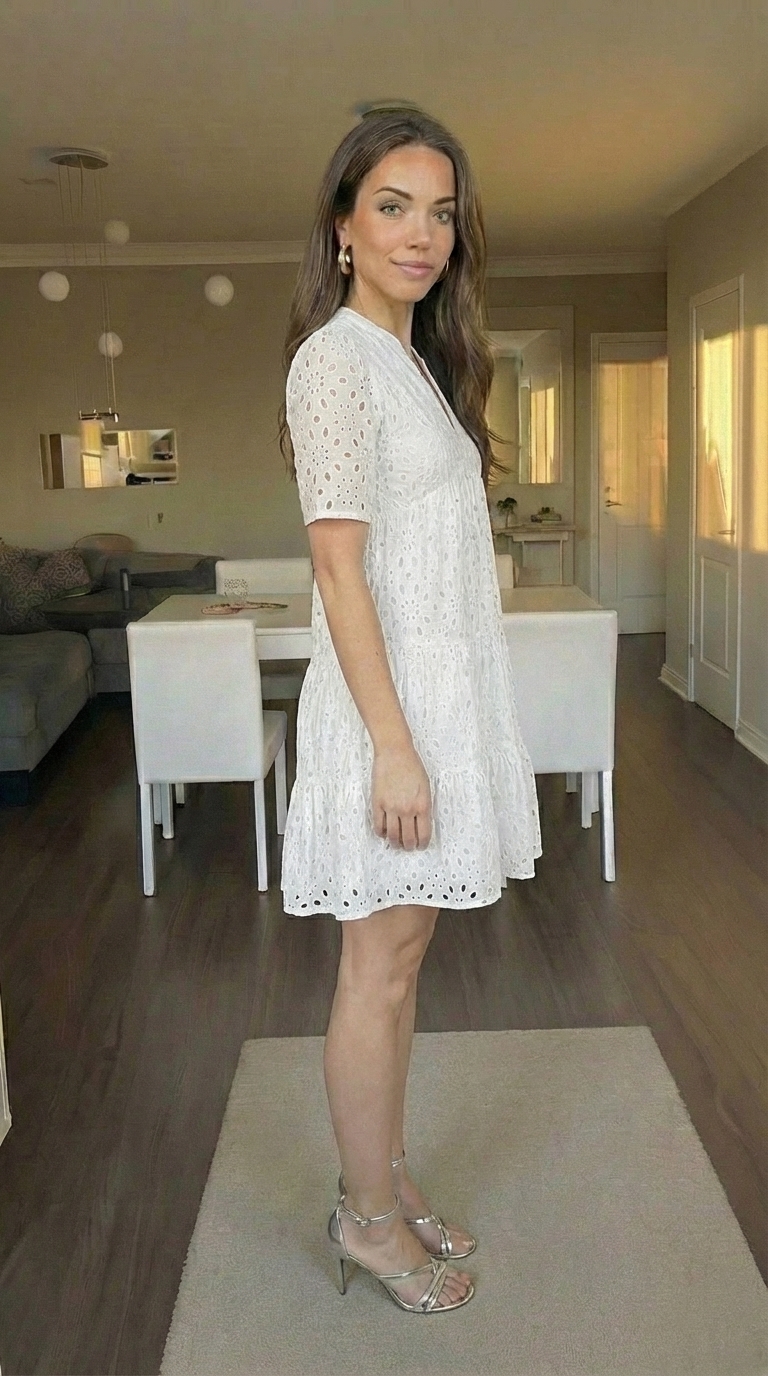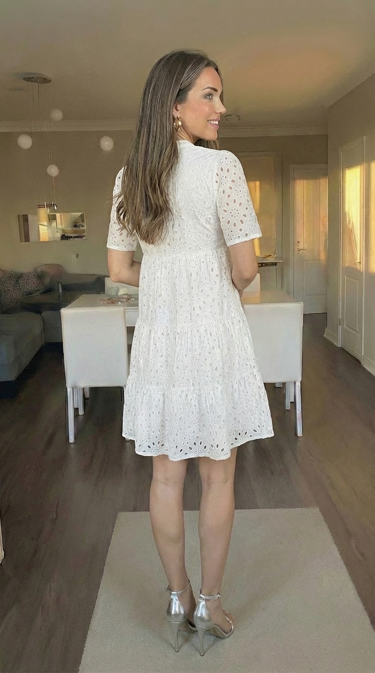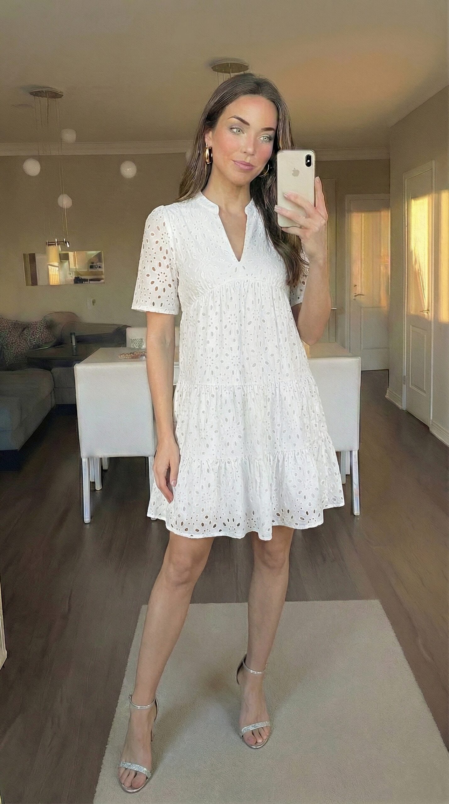 This dress includes a hollow‑out design, a casual V‑neck, short sleeves, embroidered eyelet details, a tiered skirt, and a flowy A‑line shape. Furthermore, the mini length creates a fresh and youthful look.
