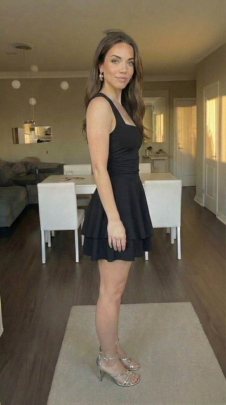 For a night out, I added strappy heels, a sleek clutch, and statement earrings. Additionally, the square neck works beautifully with bold necklaces or layered chains. A strong lip color elevated the whole outfit.