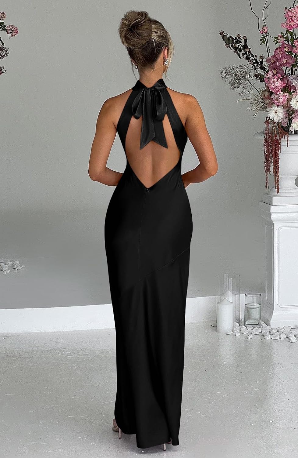 Features: The dress is fully backless with a high neck and an oversized tie detail. Moreover, the maxi length adds an elegant and sexy touch.