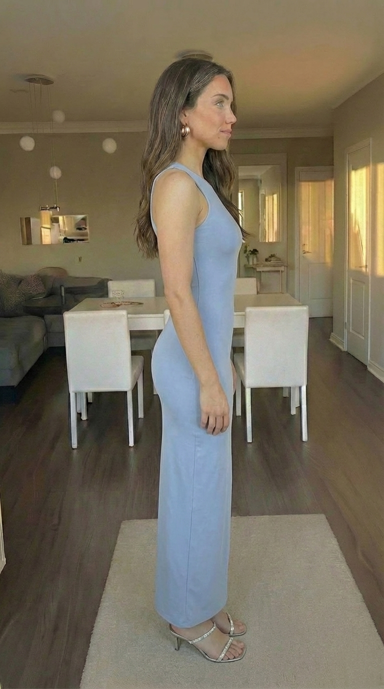 On me, the dress hugs gently through the bodice and hips, then flows slightly toward the hem to create a balanced silhouette that feels feminine but relaxed. The halter neckline draws attention to my shoulders and collarbone, which I like for both casual and dressed-up looks.