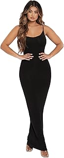 This dress includes a scoop neck, sleeveless cut, adjustable spaghetti straps, and an ankle‑length bodycon shape. Additionally, the maxi design creates a smooth, elongated silhouette.