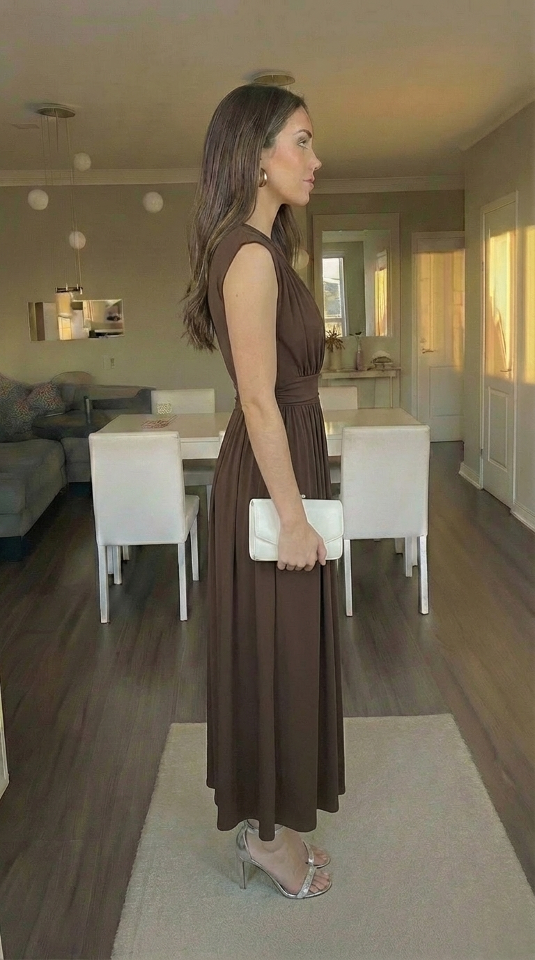 To make the dress more formal, I swapped sandals for strappy heels and added statement earrings. Additionally, a lightweight shawl created a soft, elegant touch. A clutch and a polished updo completed the look.
