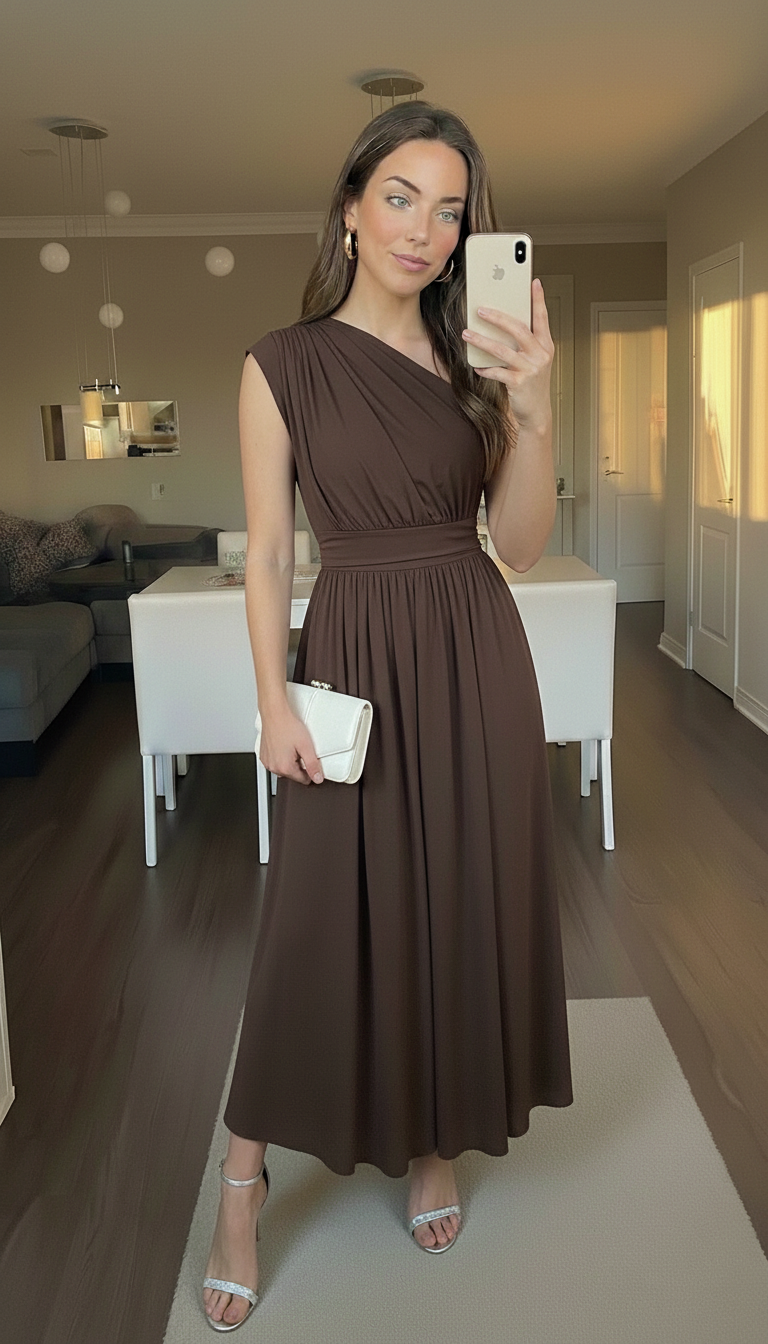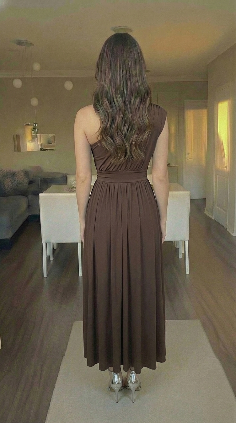 Features: This dress includes a casual maxi cut, a slim one‑shoulder neckline, a sleeveless design, solid colors, stretch fabric, two side pockets, an A‑line shape, pleats, and a swing‑flowy silhouette. Additionally, it blends sophistication with a touch of romance.